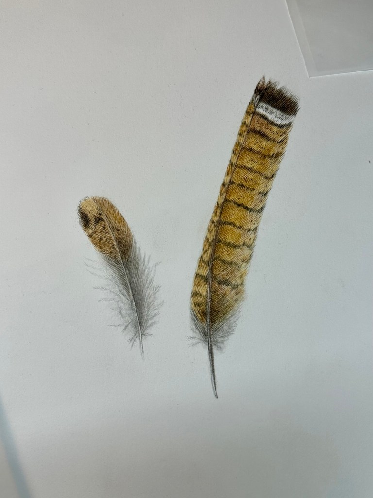 Tail and breast feather from Ruffed Grouse. Bonasa umbellus. Colored pencil.